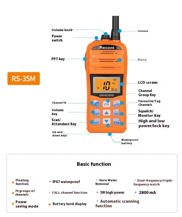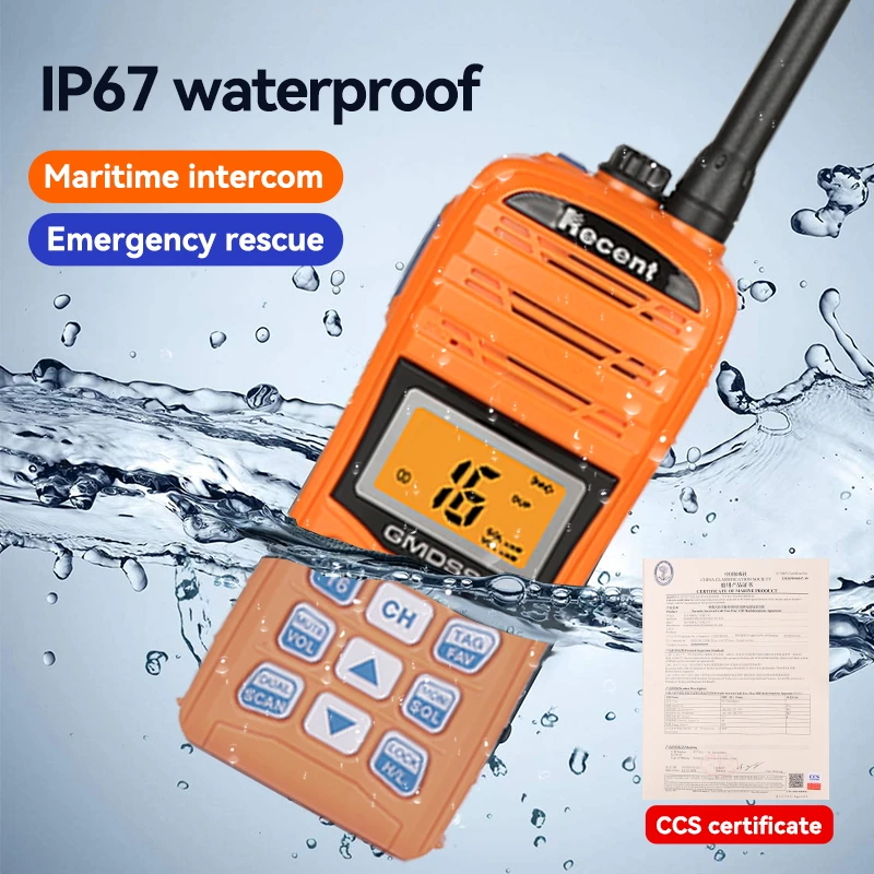 Radio VHF marino 3W, flotante, IPX7 y con batería de emergencia. Ideal para comunicación crítica en embarcaciones.